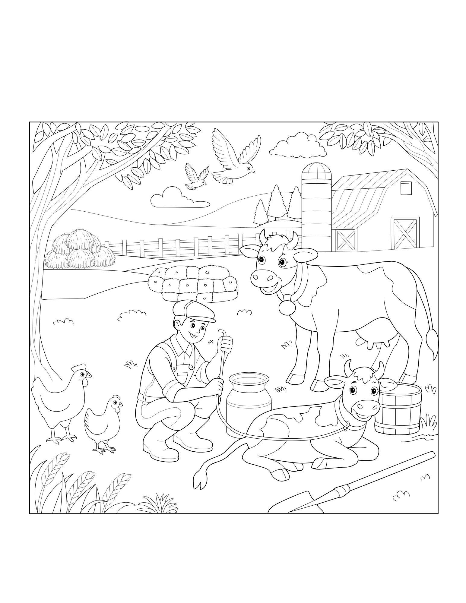 A delightful coloring book filled with charming farm animals, busy tractors, friendly farmers, and peaceful countryside scenes — perfect for young artists!